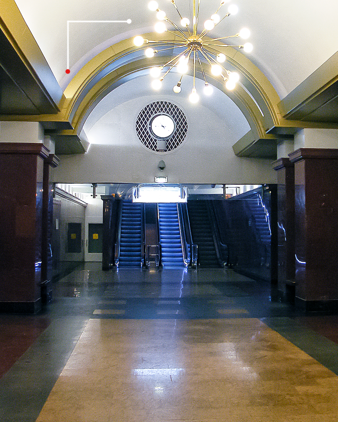 Филадный портал, назовём его так, — это прикольно, интересно, но пустовато. Огромные люстры перебивают просмотр. Над эскалаторами висят механические часы, но для кого они там? Чтобы посмотреть, который час, нужно очень высоко задрать голову. А если смотреть издалека, то люстры либо отражаются в стекле часов, либо перекрывают просмотр, либо ярко светят в глаза — ничего невозможно разглядеть, непонятно, сколько времени. Можно же сделать большое электронное табло для всех.
