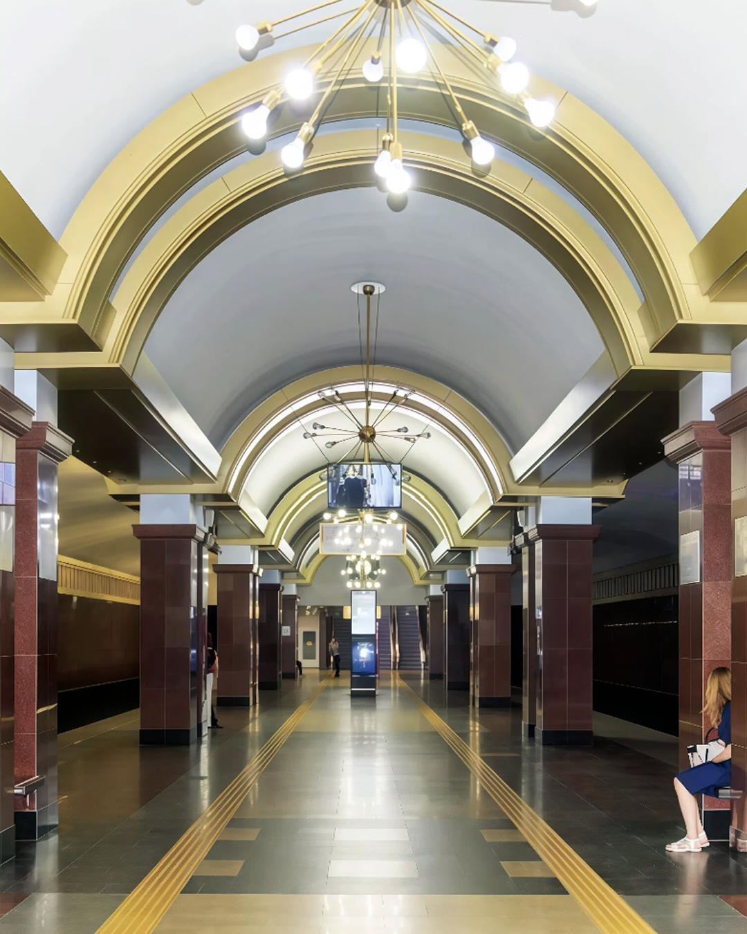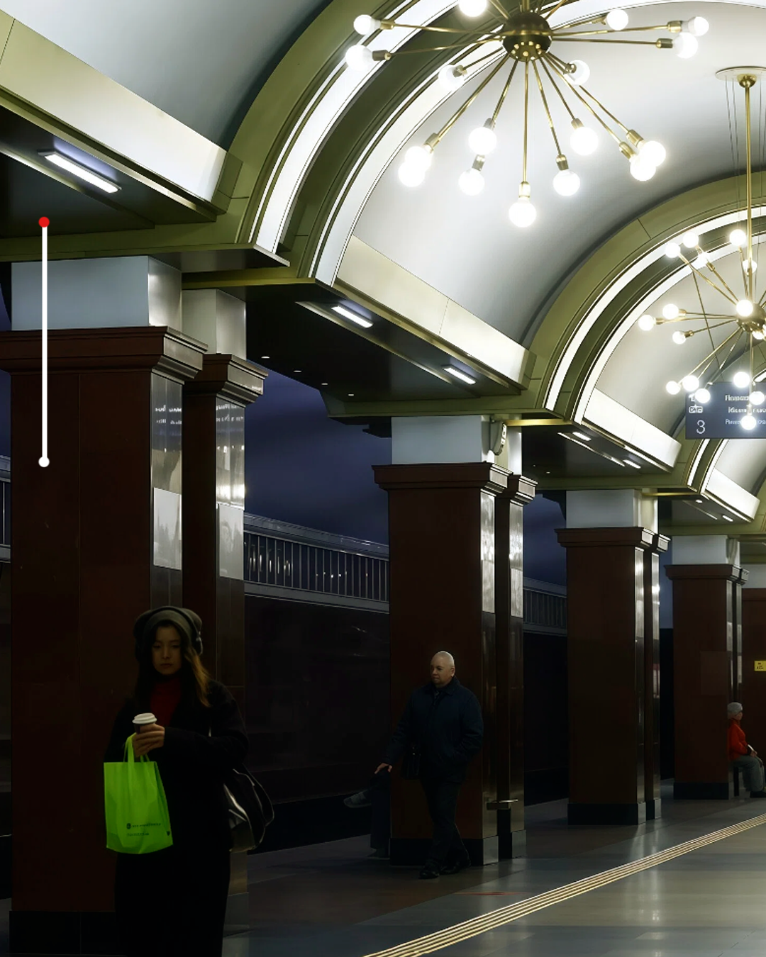 Есть подсветка арочного свода из-за карнизов, но не подумали заложить подсветку колонн. И если уж сделали подсветку центрального свода, то почему тогда не сделать её на путях, почему не подсветить потолок вдоль движения поездов по станции? К тому же можно было сделать такой красивый свод, создать национальные акценты, нанести роспись яркую — кажется, было бы интереснее.