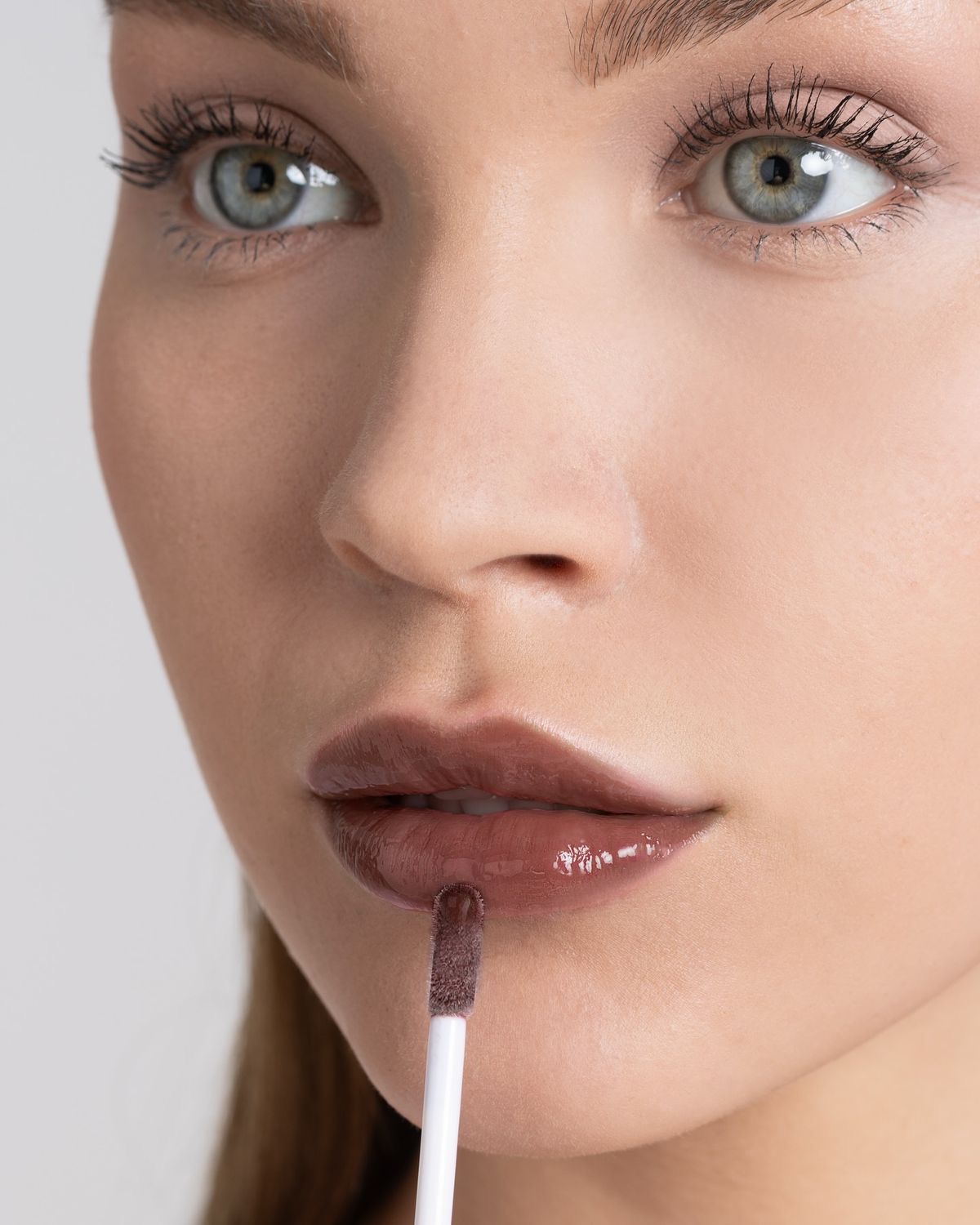 Предпочтительные цвета — чистые розовые, карамельные, прозрачные и ягодные. Нанесите бальзам, сверху — каплю блеска в центр нижней губы и распределите пальцем. Это создаст модный «стеклянный» эффект, но без липкости.