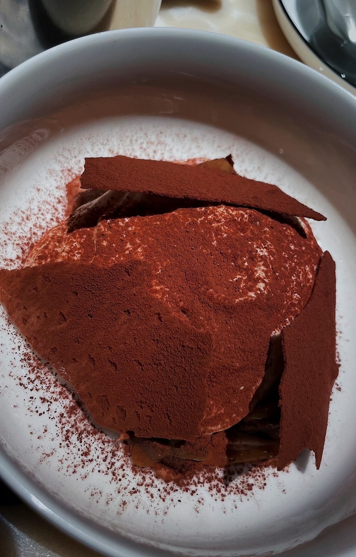 Это тирамису-конструктор, классика в новом прочтении (ингредиенты те же, но пересобраны). Десерт разобрали по текстурам: снизу кофейный крем с ванилью, карамель. Следующий слой - шоколадный бисквит, замоченный в сиропе на основе кофе и ликера. Дальше мусс на кофейных зернах с кофейным ликером и маскарпоне. А украшают эту неприторную сладость какао-чипсы. Пожалуй, вкуснее тирамису я пробовала только в Италии. Кстати, у бренд-шефа есть планы ввести в меню заведения сети на улице Дзержинского фисташковое тирамису с матчей.