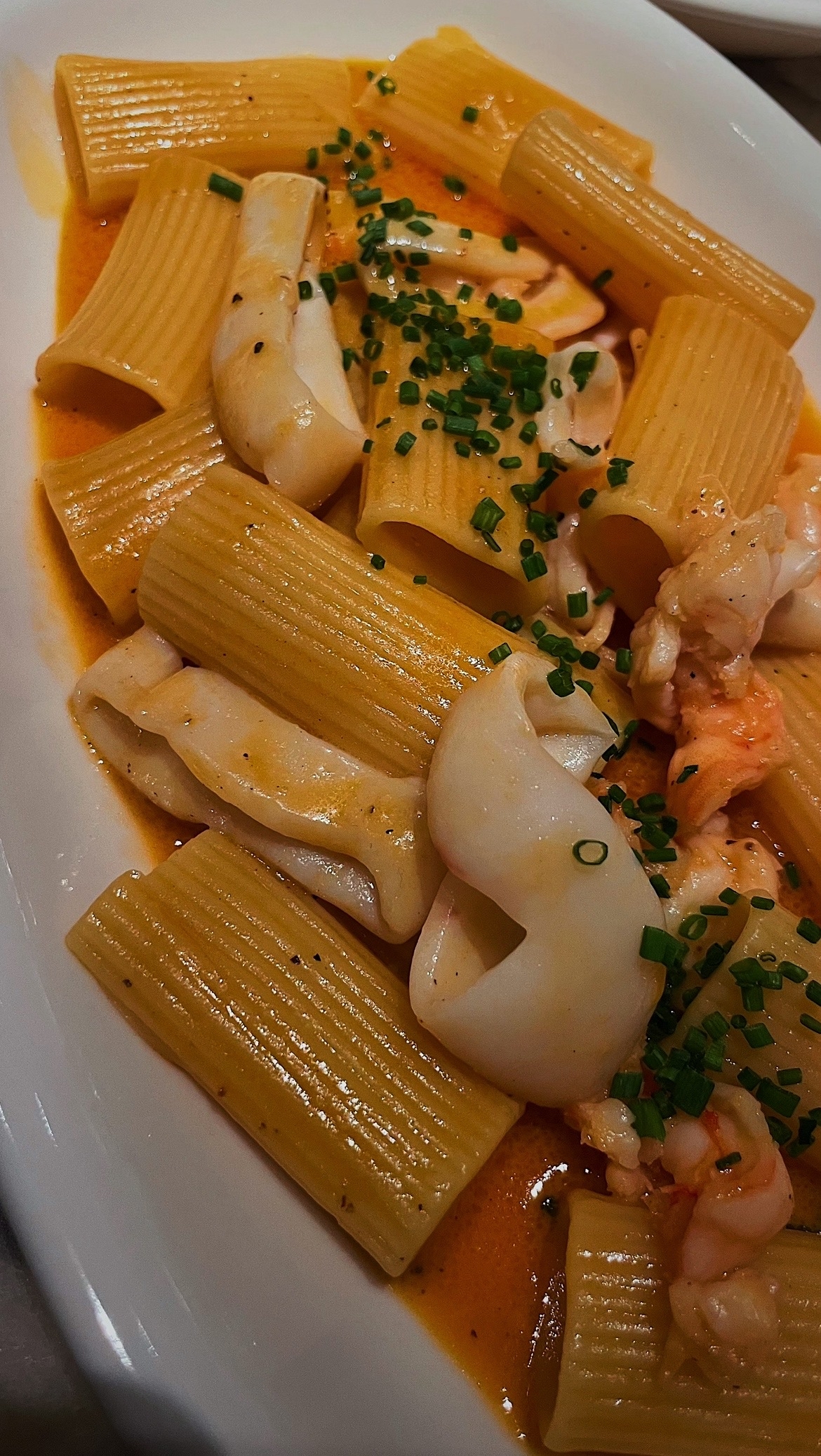 Креветки и кальмары готовятся по технологии су-вид: они вакуумируются в пакете и медленно готовятся на водяной бане при точно контролируемой низкой температуре. Для пасты используется соус биск на основе бульона из креветок в панцире, томатов, тимьяна и сливочного масла. На выходе идеальное блюдо для фанатов морепродуктов.