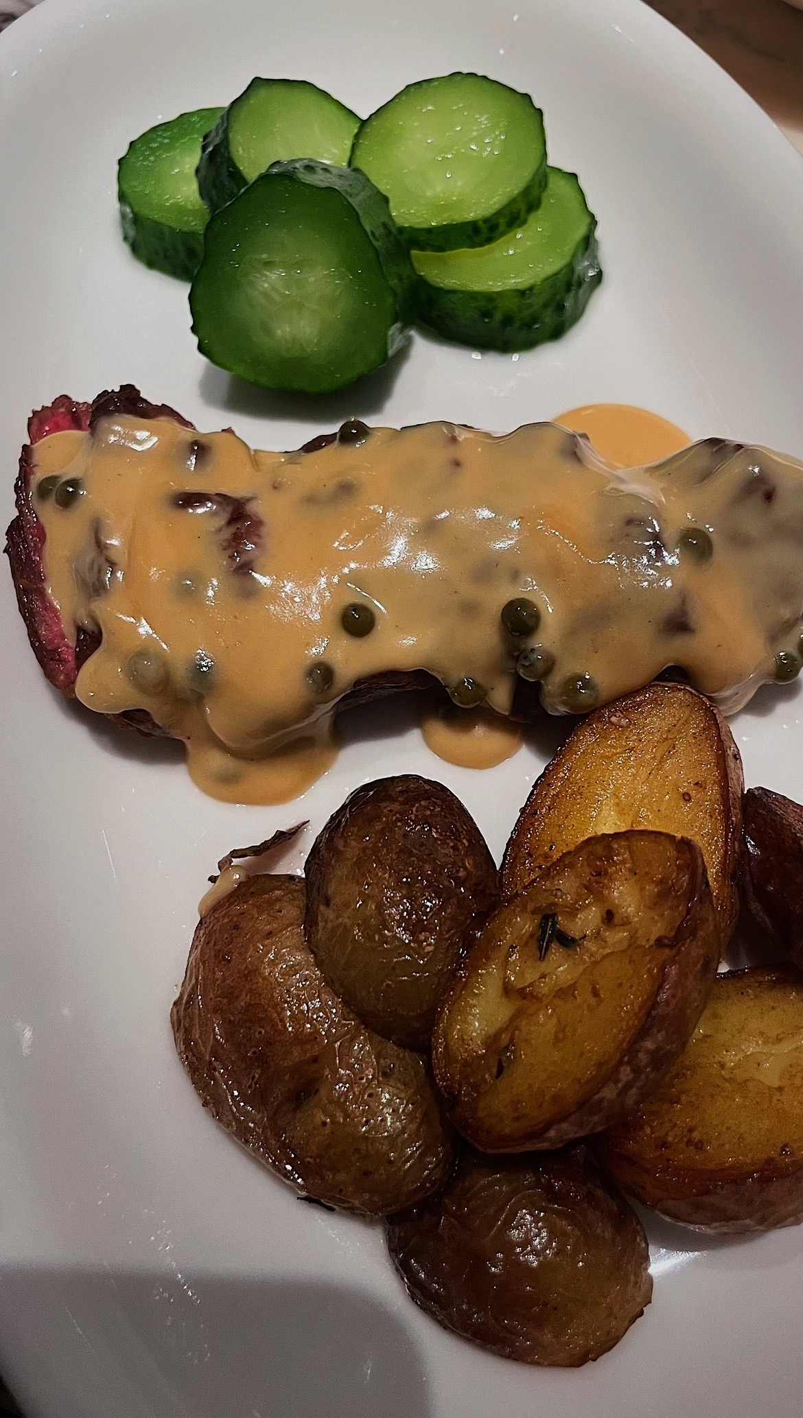 Начнем с того, что мясо очень нежное и сочное. Оно запекается в соли, а потом обжаривается с маслом бер-нуазет (это сливочное масло с карамелизированными из-за нагрева белками. У него ореховый привкус, но самих орехов в составе нет). Вопросы у меня только к перечному соусу на основе сливок, соуса жу и зеленого перца: он показался слишком солоноватым и перебивающим вкус блюда. Если бы он подавался отдельно, можно было бы регулировать его концентрацию, но им полит весь стейк. Блюдо подается с беби-картофелем и умопомрачительными малосольными огурчиками, за которые можно продать душу.