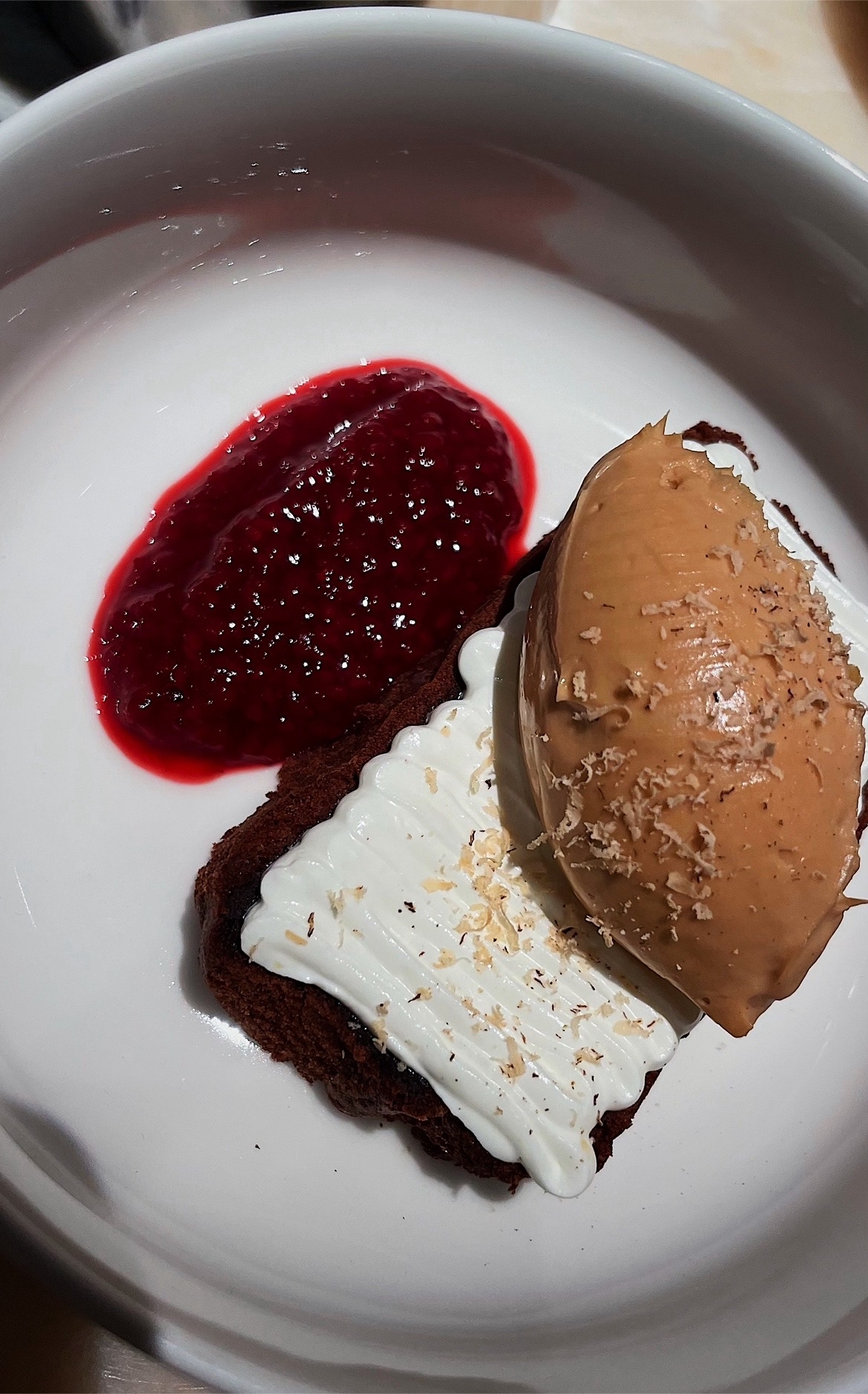 По сути, это тоже блюдо-конструктор. Основной ингредиент, приковывающий внимание, - крем на основе запеченного бельгийского белого шоколада и сметаны, который по вкусу очень сильно похож на вареную сгущенку (но вы-то теперь знаете, что это бельгийский шоколад). Здесь же сметанный крем на шоколадном бисквите и малиновое варенье для баланса кислинки.