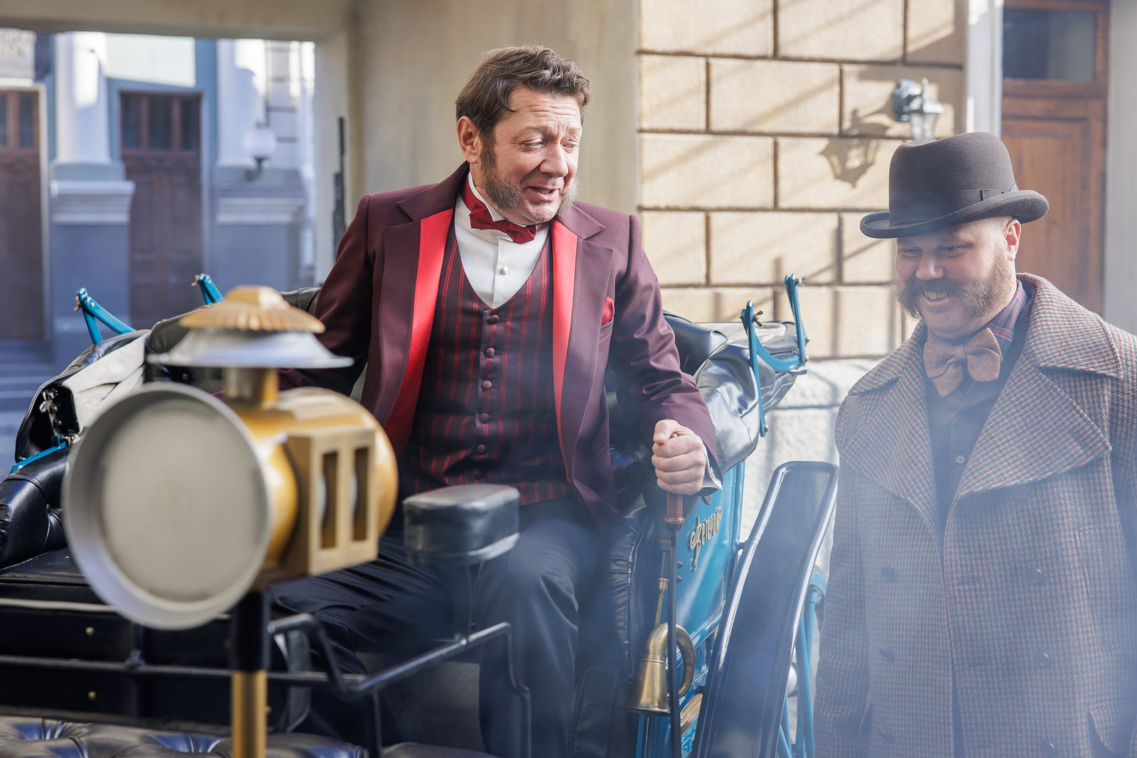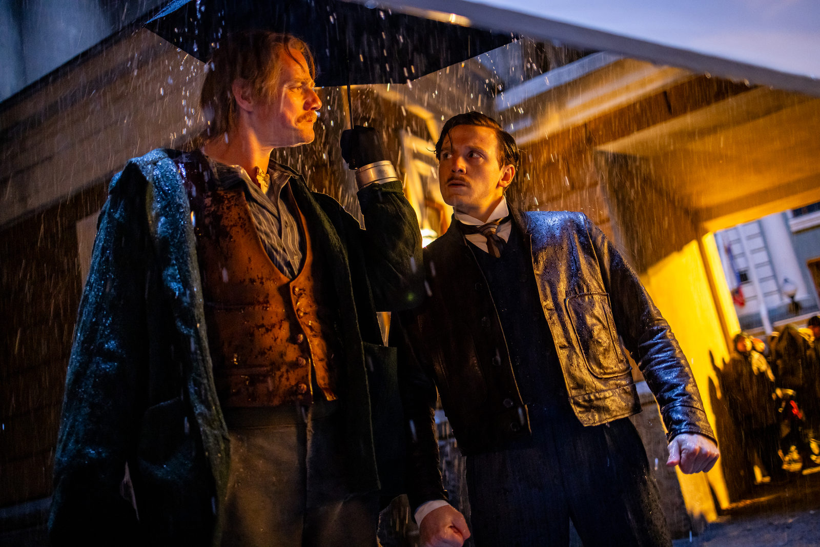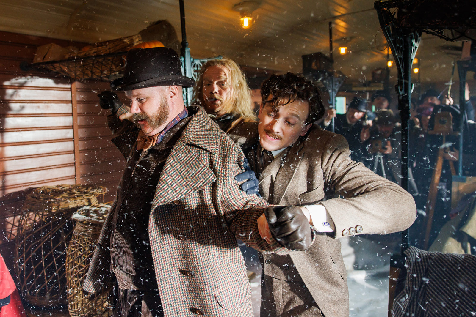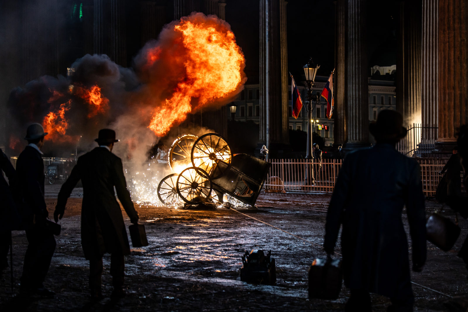 Вся визуальная составляющая здесь очень хороша. Свет, композиция кадров, интерьеры Петербурга XIX века – глаз радуется практически весь фильм. Да, уличные сцены выглядят не так убедительно, но их не много. На протяжении картины создатели используют разные приемы: например, драка главных героев с персонажем Андрея Пынзару показана в невероятном замедлении, иногда даже сменой статичных кадров – это эффектно. Еще частый прием: когда нужно ускорить время и показать большое количество действий, используют несколько копий героев (как популярный эффект в ТикТоке, только тут это сделано профессионально и стильно).
