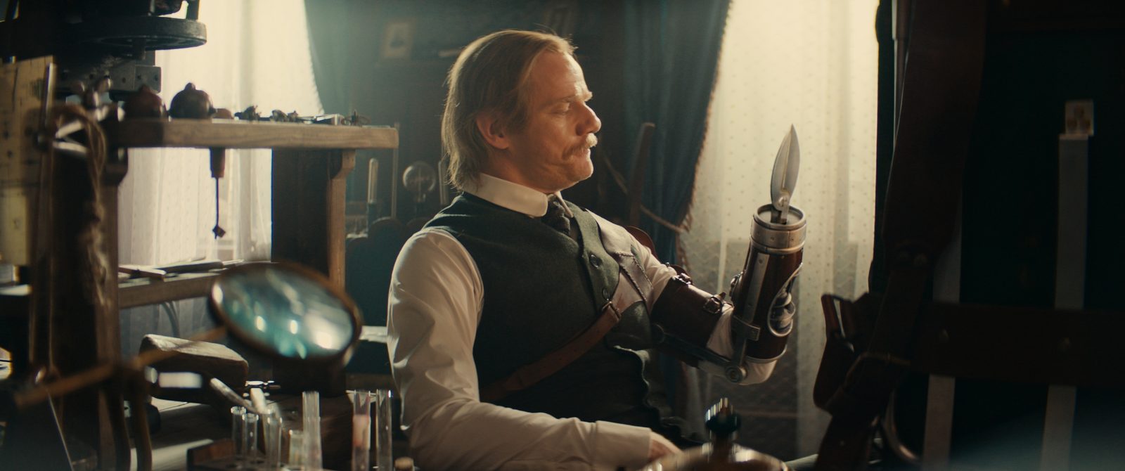 Куликов создал интересный мир, за которым хочется наблюдать. Это XIX век, но с очень продвинутыми технологиями, которые иногда даже граничат с фантастикой. Правда, есть нюанс: его недостаточно раскрыли, не совсем понятны его правила и порядки. То, что Левша создал волососушку (фен), кардольки (картофель по-деревенски), у него не дом, а склад Инспектора Гаджета - это забавно. Одна из важных фишек героя – необычный протез вместо правой руки, в который миллион различных предметов: от штопора до молотка. И ты весь фильм ждешь, когда это пригодится, но… этого просто не случается. Ни одной сцены, когда он используется эту фишку. Чеховское ружье так и осталось висеть на стене.