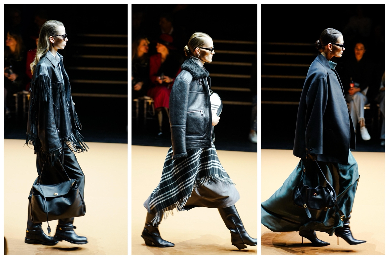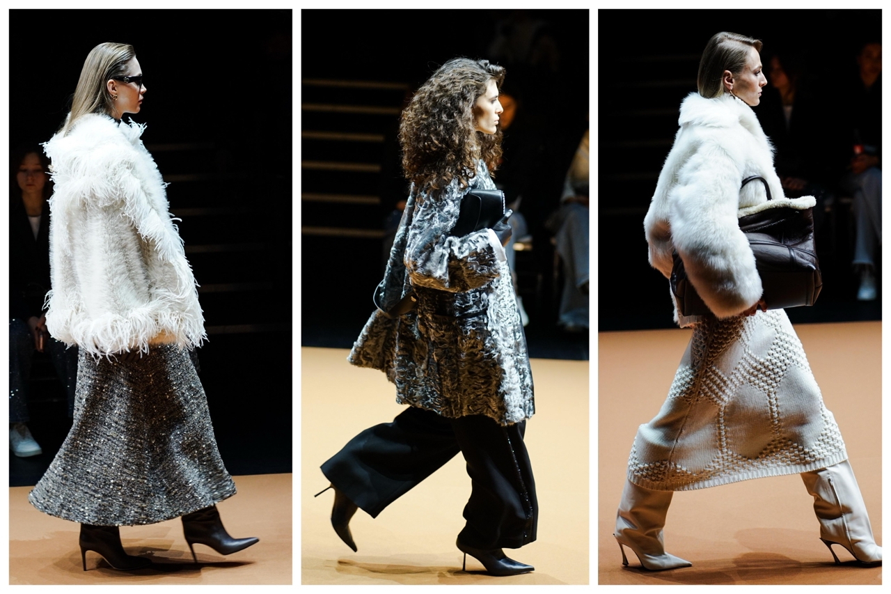 Одним из моих фаворитов на этом дефиле стал вязаный комплект из свитера и юбки от Elie Saab. В сочетании с шубой в стиле mob wife от Bottega Veneta и белыми высокими сапожками от Mugler этот наряд обещает нам снежную и уютную зиму. Даже тоут от Bottega Veneta добавляет мягкости к этому образу своей меховой оторочкой.