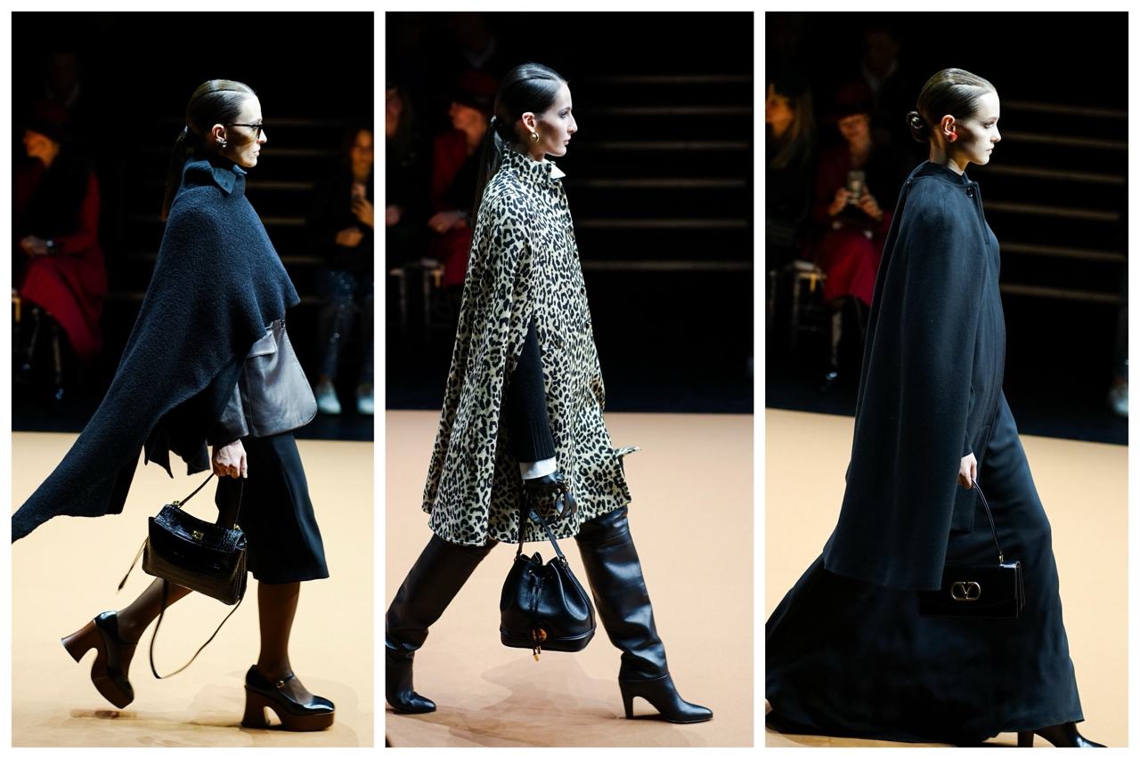 Исключение - леопардовый кейп от Valentino, который радует взгляд надоевшим принтом. Несмотря ни на что, леопард продолжает свое шествие по подиумам уже который сезон. В зиму он приходит как символ согревающей жестокой зимы.