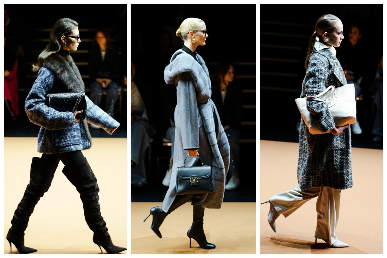 Более сдержанное, но не менее роскошное длинное пальто от MVST в таких же пепельно-голубых оттенках с широким норковым капюшоном стилизуется с ботфортами от Le Silla и кожаными перчатками Valentino. Третий вариант пальто от MVST в этой же цветовой гамме в крупную клетку разбавлен широкими летящими брюками того же бренда и объемным тоутом от Valentino.