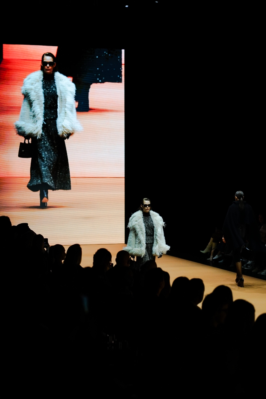 Конечно, зимняя коллекция изобилует мехами, что и понятно. Шикарная шубка с мехом разной длины от Elie Saab в сочетании с твидовым топом и юбкой от Giambattista Valli смотрится очень выигрышно на фоне других образов на подиуме. Пальто от Giorgio Armani под стриженную норку в комплекте с блузой и брюками того же бренда относит нас к экспериментальной моде 70-х, хотя стриженная норка, в том числе из эко-меха - обязательный тренд этого сезона.