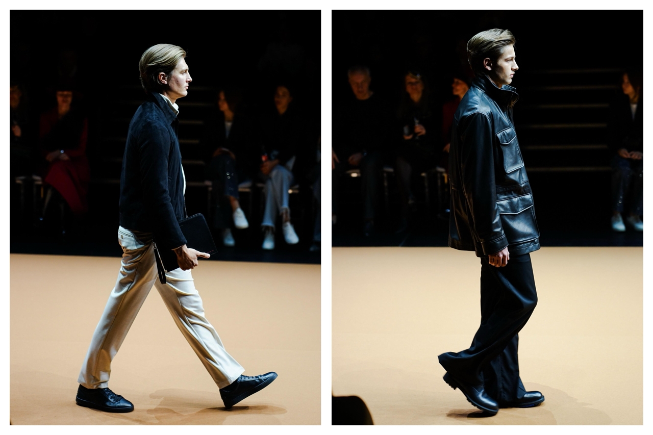 Офисные варианты Джеймса Бонда также были представлены на дефиле многочисленными дубленками, бомберами и кожаными куртками от Brunello Cucinelli, Giorgio Armani, Brioni и Kiton.