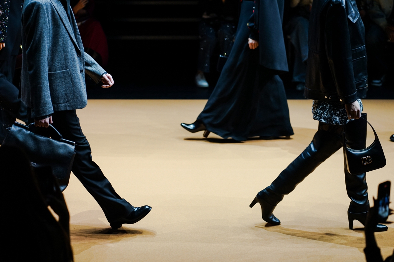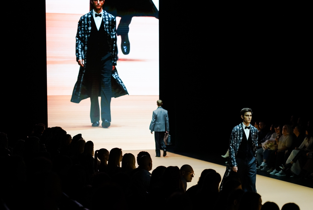Несомненно, халатная эстетика современной моды добавила беззаботности происходящему на подиуме. Привлек внимание и еще один вариант мужского халата от Dolce & Gabbana, на этот раз выполняющий роль полноценного пиджака. Подобранный поясом и дополненный шелковым платком-паше, этот образ рисует воображению московского Бенедикта Камбербэтча в домашней обстановке со свежим выпуском The Guardian в руках.
