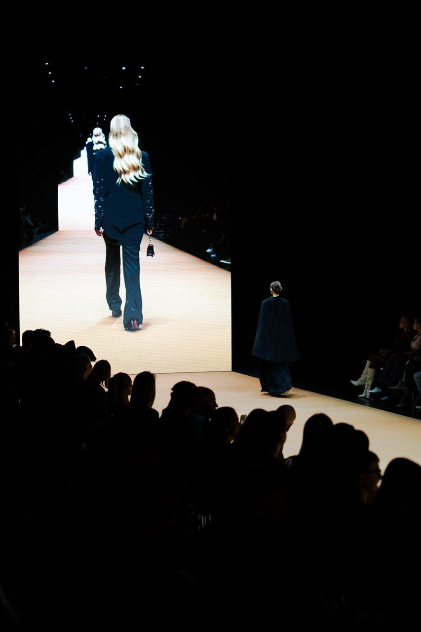 Есть ощущение, что стилисты Барвиха Luxury Village перестарались с эпичностью дефиле и забыли про эстетику стилизации показа. Один за другим образы разочаровывают своей претенциозностью и неуместной элитарностью. Например, темно-синий широкий шарф MVST стилизуется под накидку, частично закрывая коричневый кожаный жакет и черную узкую юбку того же бренда, что формирует необычный и женственный силуэт, а правильный акцент в образе создают туфли babies на массивном каблуке от Chloé. Но глаз снова не может отличить один элемент одежды от другого, собирая весь образ в один бесконечный темный контур.
