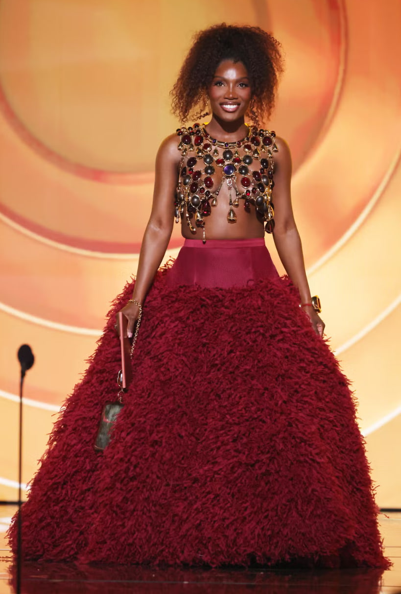 Американская рэперша не любит полумер и на «Грэмми» устроила настоящий праздник цвета. На красной дорожке певица сияла в кастомном платье Roberto Cavalli: оранжево-фиолетовом, с глубоким декольте и с гигантским объёмным шлейфом, обильно расшитым бисером и рюшами. Всё это великолепие было приправлено этническими украшениями в тон платья и очень нейтральным макияжем. Во время вручения наград наряд певицы сменился. На сцену она вышла в топе из крупных разноцветных камней и бордовой пушистой юбке. На мой скромный вкус – один из лучших выходов певицы.