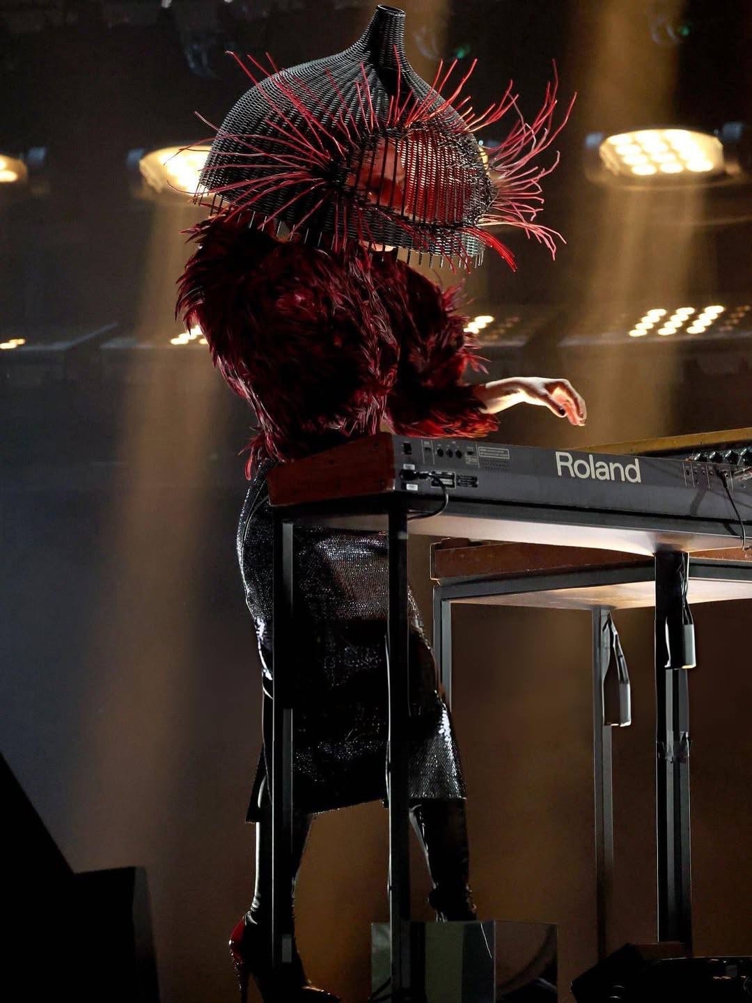 Позже на сцене Гага поразила еще больше — на выступлении она предстала в архивном образе от модного дома Alexander McQueen из коллекции Fall 2009: красно-чёрном жакете с подплечниками и перьями, скульптурной юбкой и, конечно, как минимум небанальным головным убором. На голове певицы красовалось нечто, похожее на шляпу, от дизайнера Philip Treacy. Такой реверанс в сторону Маккуина выглядел свежо и, откровенно говоря, затмил многих звёзд на премии. Оба её лука создали ощущение модной феерии – ну что ж, в этом Леди Гаге равных нет.