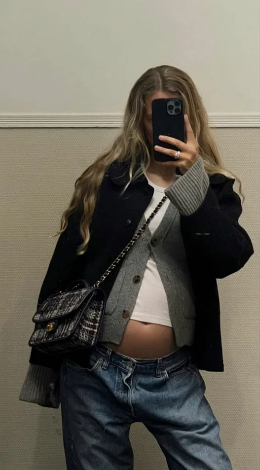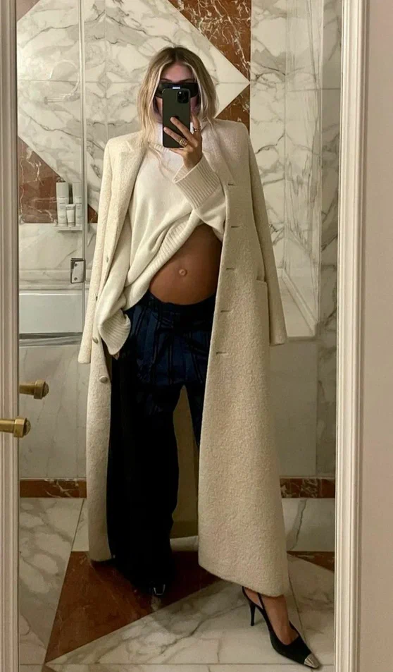 Многослойность и «оверсайз». Свободное пальто и приталенный жакет – находка для беременных. Такая комбинация красиво подчеркивает живёт и очень комфортна в носке. Присмотритесь к скандинавским модницам, которые умело миксуют фактуры и силуэты в своём гардеробе. Классным выбором будет сочетание расслабленной белой майки, классического тренча и бэгги-джинс.