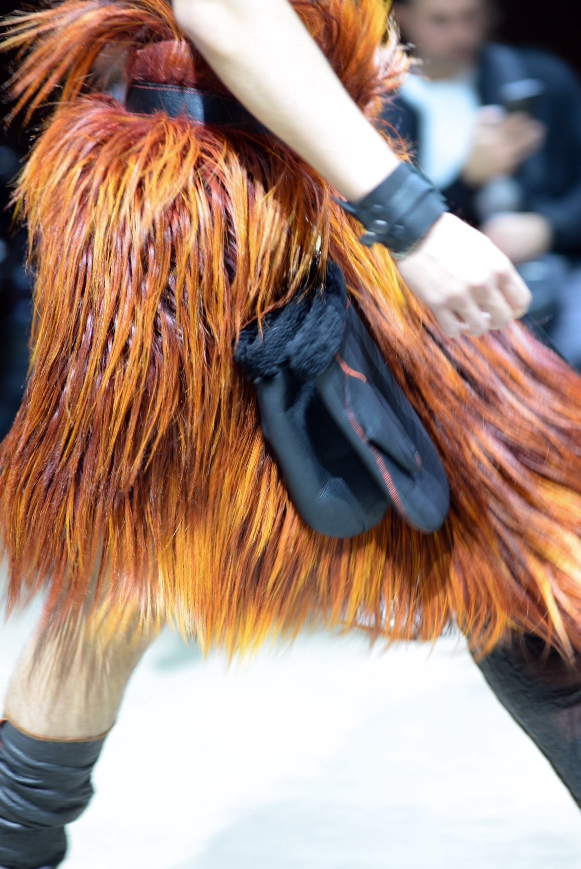 Каждый образ откликался эхом «хочу» и смотрелся органично и профессионально. Дефиле завершал шикарный Тарзан в яркой набедренной повязке с длинным ворсом. Весь показ меня не отпускало ощущение, что все образы, которые представлены на подиуме, были созданы вручную каким-то шаманом, живущим далеко в горах. Мое воображение рисовало Jeremiah Johnson Роберта Редфорда и эпизод, где он обменивается меховыми трофеями с туземцами.
