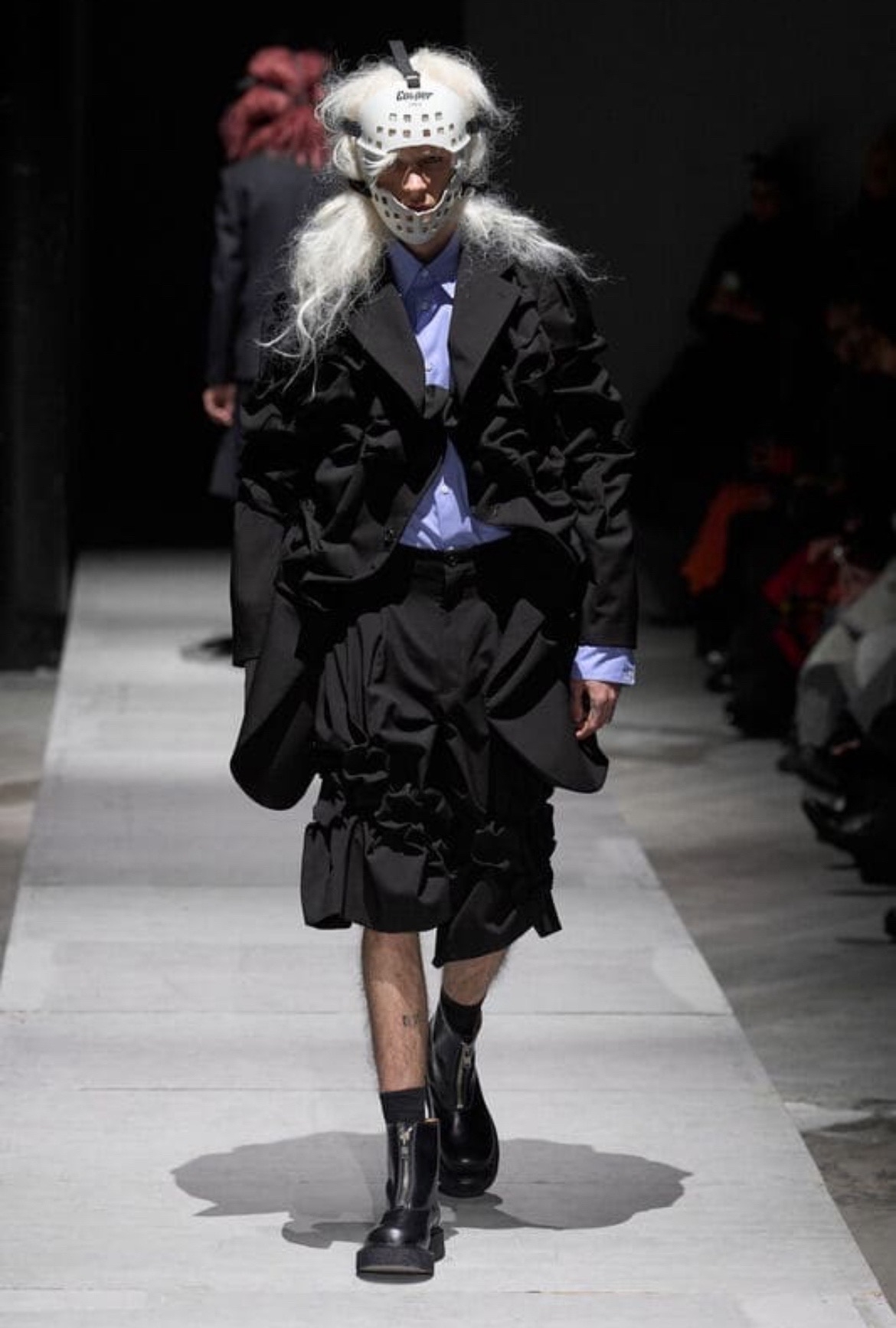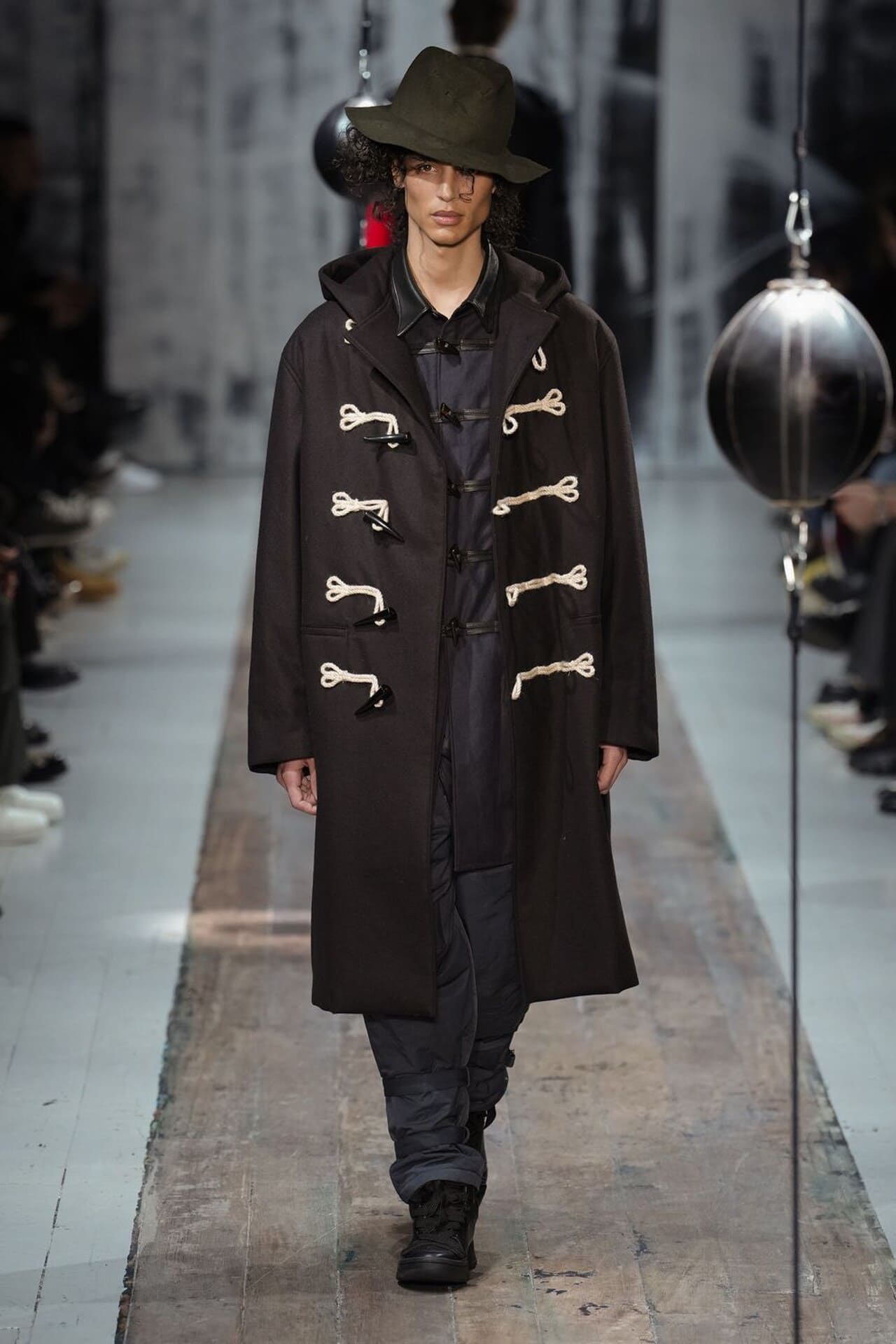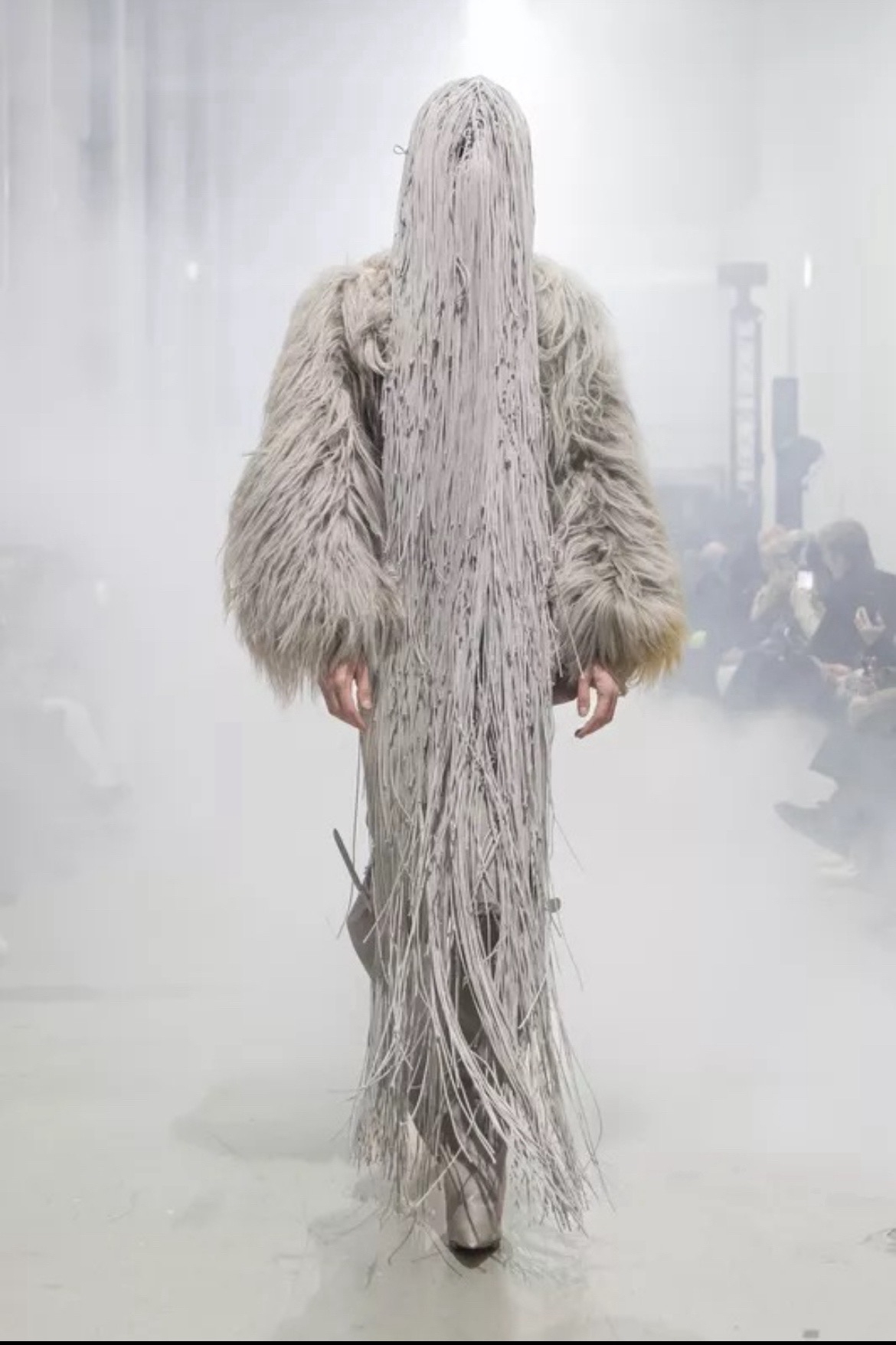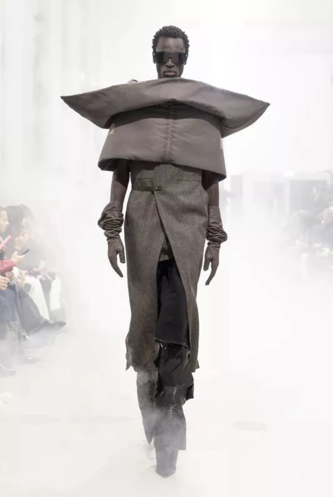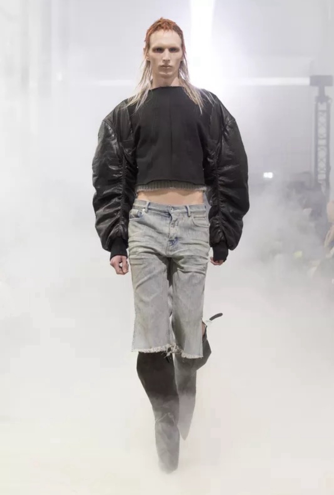 Показ Rick Owens прошёл в туманной атмосфере Palais de Tokyo и напоминал театральную постановке в духе постапокалипсиса. Весьма в духе бренда. На затопленную дымом сцену вышли модели, облачённые в тяжёлую тёмную кожу и верхнюю одежду с абсолютно сумасшедшим и архитектурным верхом.