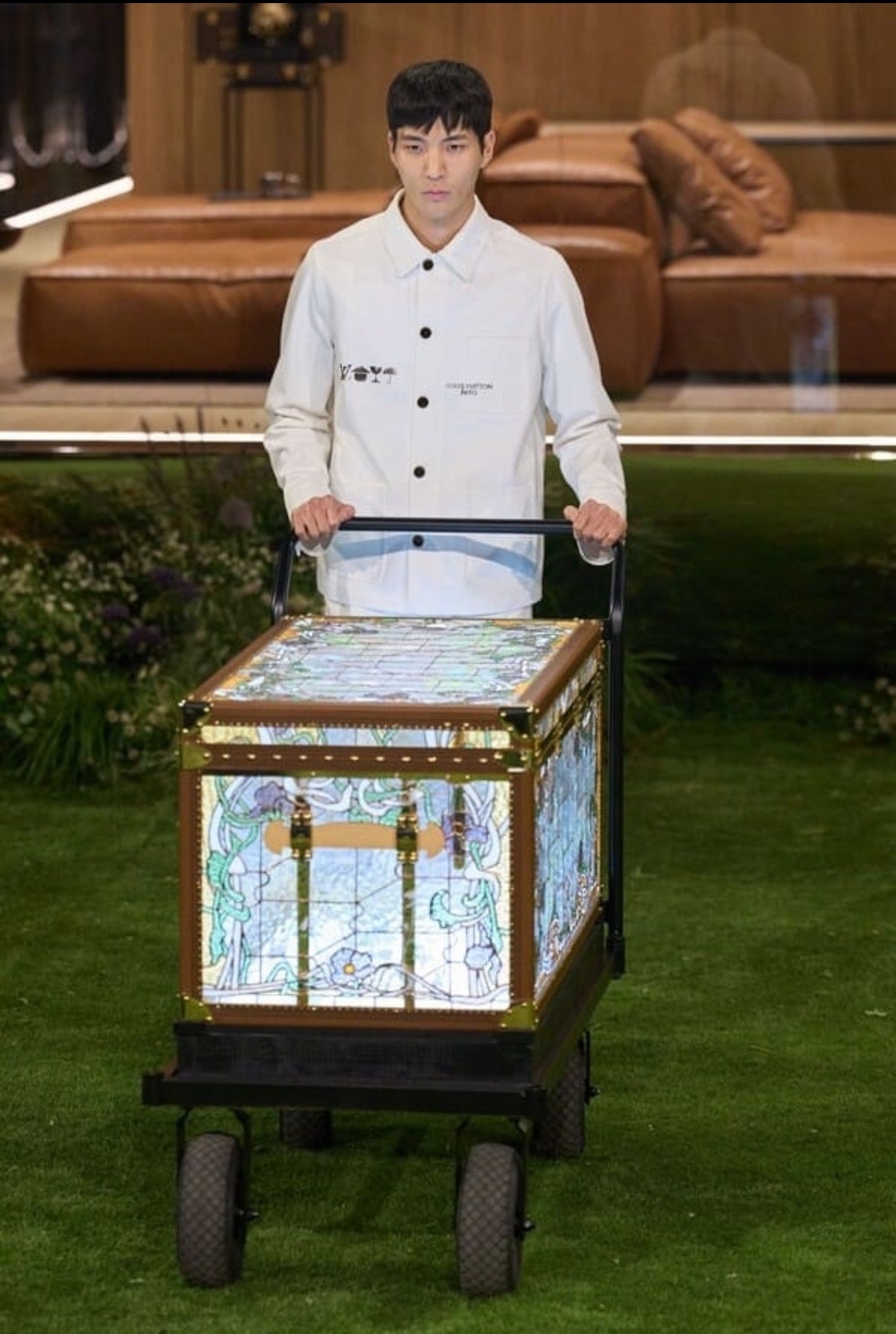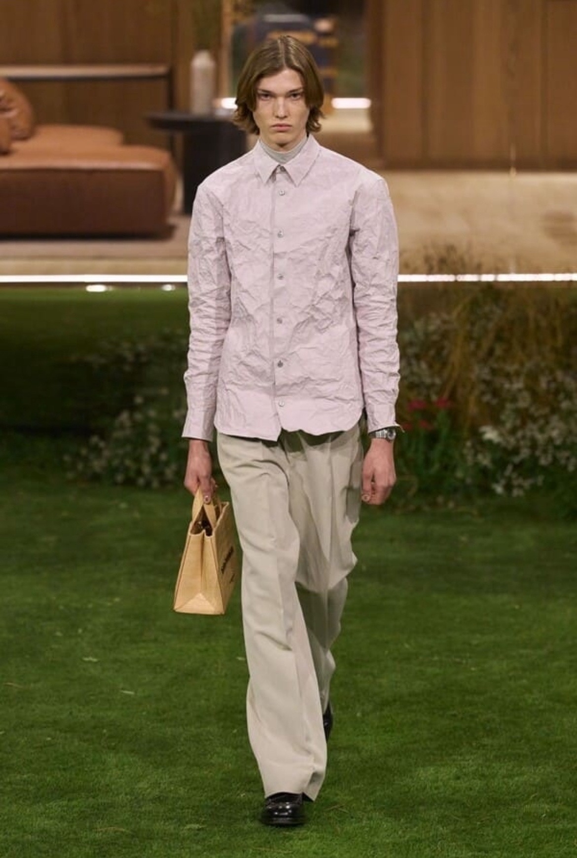 Одним из самых ярких событий стал показ Louis Vuitton под руководством Фаррелла Уильямса. Дизайнер вышел за рамки привычного шоу и поэкспериментировал с архитектурой: в центре сцены в LVMH Foundation возвышался стеклянно-деревянный павильон под названием Drophaus, окружённый японским садом. Модели сначала кружили вокруг этой конструкции, а затем вышли на подиум с новыми версиями культовых дорожных сундуков LV: они были покрыты цветочными витражами в стиле ар-нуво и светились изнутри. Удивила стилизация: на показе были представлены сочетания мужских костюмов и огромных, почти спортивных сумок. Приметной была и игра с принтами: особенно хороша клетка и монограммы, приправленные меховыми элементами. Советуем украсть эти приёмы в свой гардероб. Кроме того, Фаррел Уильямс напомнил и о том, что кожаные перчатки – не только женский аксессуар, но и выгодный акцент в мужском гардеробе.