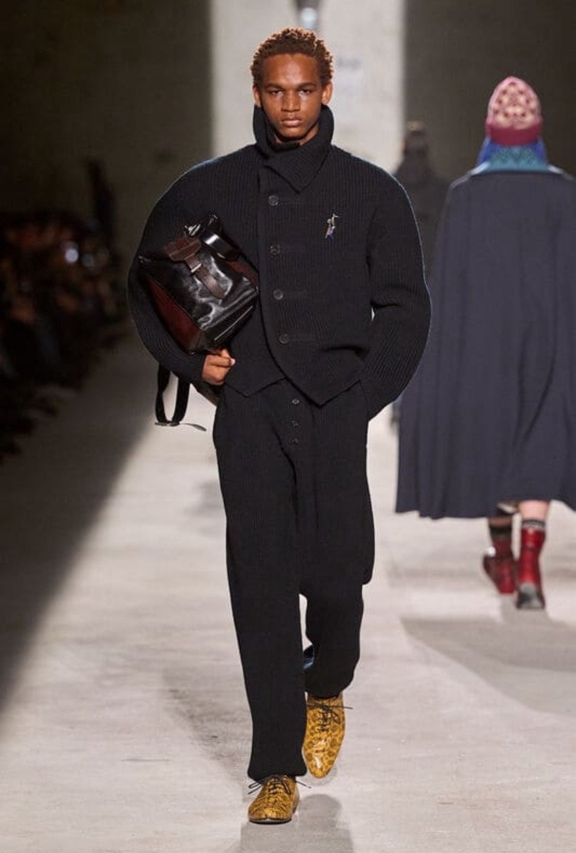 Аксессуары усиливали эти тенденции деталями. На подиумах особенно заметны были объёмные шарфы и платки: от тёплых вязанных «пледов» Dries Van Noten до легких атласных платков поверх жакетов. Также появились характерные большие сумки: у Louis Vuitton демонстрировались массивные кожаные тоуты «на каждый день», а у Dries – «бочонковые» мягкие рюкзаки из кожи. Разнообразие фасонов головных уборов тоже закономерно: от кепи с застёжкой LV до чуть помятых фетровых шляп Yohji Yamamoto – что-то найдётся на любой вкус. Таким образом, акцент на аксессуарах подчеркивает идею «слоистости» образа: детали вроде большой сумки, шарфа или шляпы становятся кульминацией наряда, оживляя зачастую сдержанные образы.