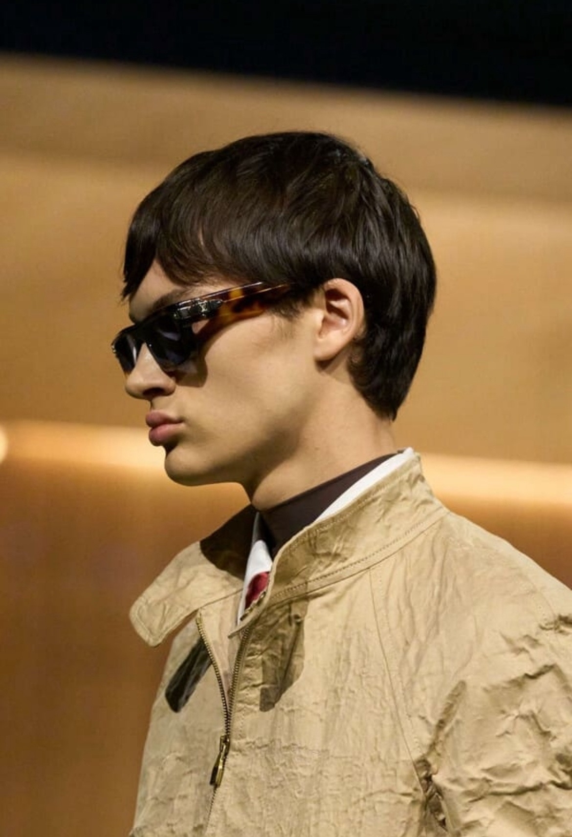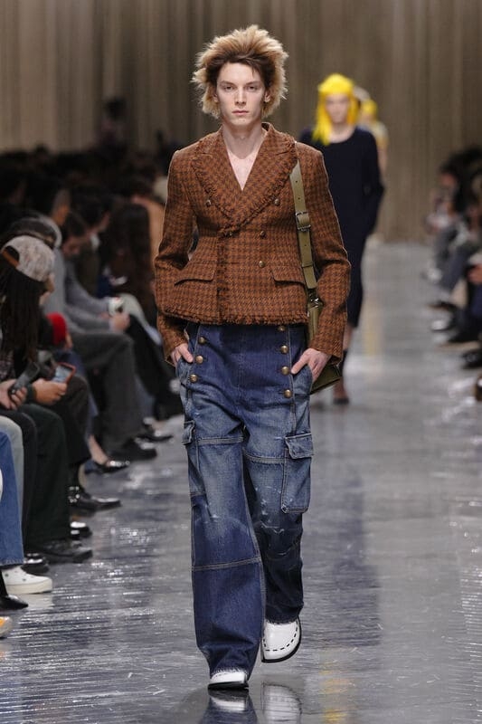 Шоу Dior Homme стало полной противоположностью минимализму: Джонатан Андерсон, второй сезон создающий мужскую линию бренда, устроил настоящий панк-карнавал с аристократическими нотками. Модельер черпал вдохновение в работах Поля Пуаре и его легендарных вечеринках, смешивая в своей коллекции блестящие атласные жилеты в пайетках, классические удлинённые фраки и короткие жакеты с неожиданными деталями. На показе в изобилии была и гусарская эстетика в самом необычном своём проявлении: например, классические рубашки с блестящими эполетами и жакеты в милитари-стиле. Модели дефилировали в ярко‑жёлтых кислотных париках, создавая достаточно эклектичную эстетику.