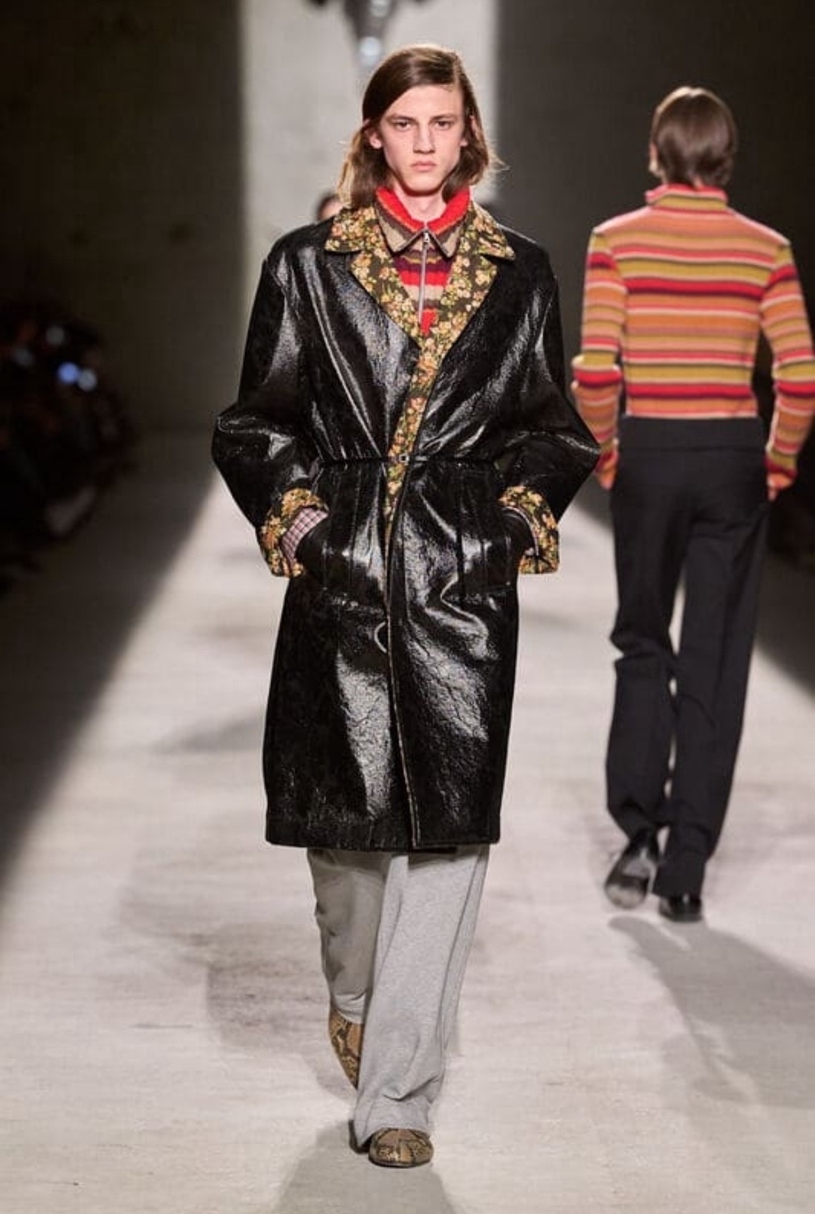 Коллекция Dries Van Noten, представленная креативным директором Джулианом Клауснером, отличилась ностальгическим посылом «совершеннолетия»: создав героя-подростка, который отправляется во взрослую жизнь, дизайнер собрал разнородный гардероб из «вещей детства». Длинные вязаные кардиганы с яркими узорами и полосками сочетались с шортами и рубашками, напоминая уютные свитеры, доставшиеся от деда. По мнению Клауснера, это была не романтическая драма, а торжество нового начала. Характерной деталью стали наслаивающиеся принты и пэчворк: полоски и шевроны сливались в одном предмете, создавая игривый и динамичный образ. Пальто демонстрировали вариативность кроя – некоторые зауживались на талии, другие превращались в кейпы, висящие на плечах. Завершением стали необычные аксессуары: например, классические броги с высокой подошвой, вязаные шапки и принтованные галстуки.