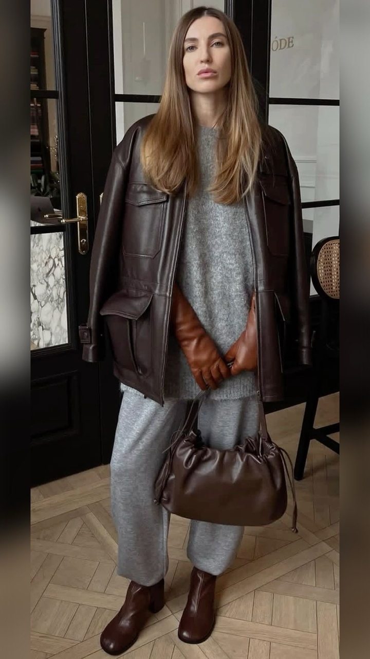 Необычный прием. Казалось бы, обилие серого или черного цвета в образе должно создать ту самую осеннюю меланхолию, но если цвет выступает в качестве единственного, а фактуры вещей – разнообразны и актуальны, то смотреться такой total-look будет изумительно. Тем более, никто не заставляет вас ограничиваться только лишь цветами-ахроматами. Вместо них вы можете выбрать бежевый или трендовый Mocha Mousse, и сразу заметите, как всё заиграет совершенно другими красками. Особенно если использовать оттенки в образе от теплого молочного кофе до насыщенного шоколада. Такой прием визуально вытягивает силуэт и добавляет ему элегантности.