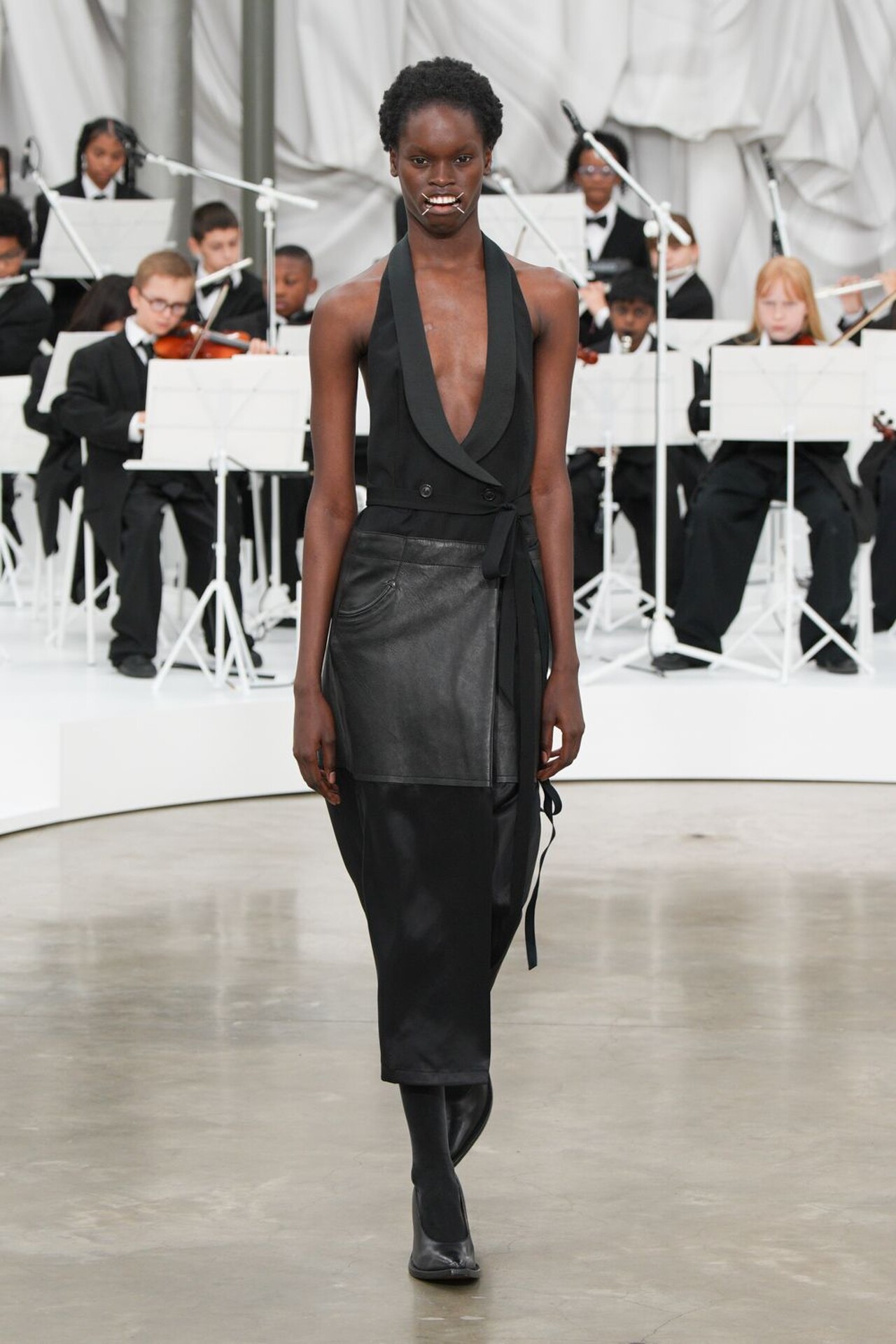 Переходный этап прошёл и в Maison Margiela: Гленн Мартенс представил свою первую полноценную коллекцию для марки, но и здесь отразился новый тренд: акцент на носибельность. Мартенс сделал ставку на сдержанную минималистичную эстетику, где главная роль – у базовых элементов гардероба: структурированные костюмы, широкие джинсы, простые рубашки и платья нейтральных тонов. Несмотря на скромную гамму, детали одежды отсылали к узнаваемым архива – например, пальто с фигурными вырезами или «нагромождение» платков на пиджак, – подчёркивая старые коды Дома в новой интерпретации. В описании коллекции звучало, что это «серия концепций и предложений для реальной жизни», где каждое решение логично включается в повседневный гардероб. Такой подход создал образ комфортной классики модного дома. Интересно, как Дом обыграл макияж моделей: распущенные волосы и скобы в виде фирменного знака на губах, что выглядело достаточно свежо и не позволило бренду скатиться в бесформенную банальщину на фоне прочих показов.