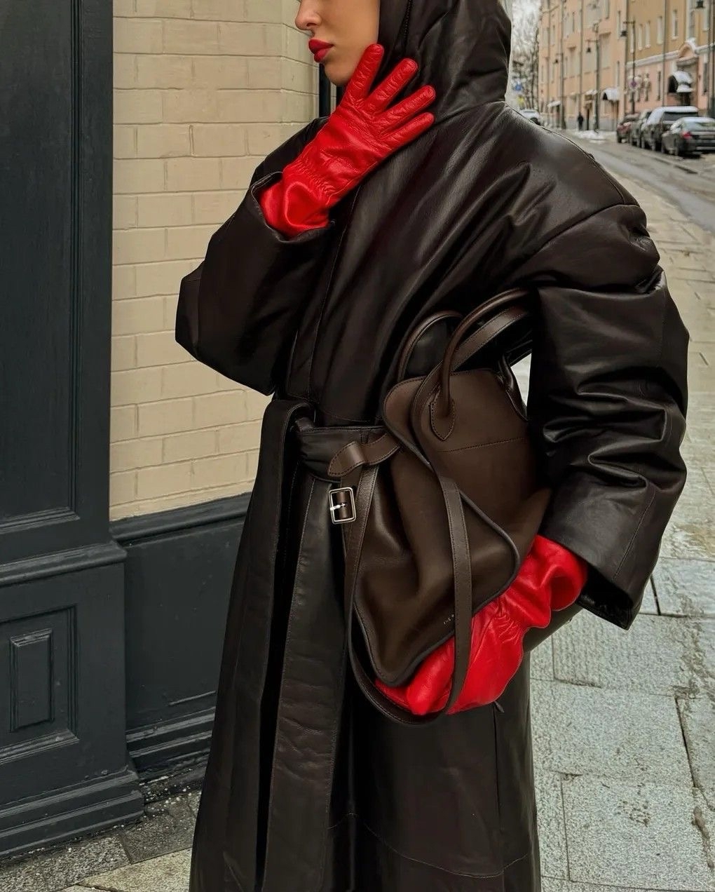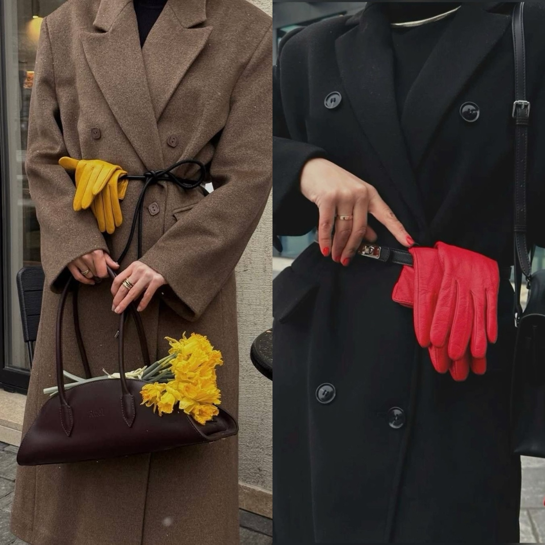 В центре внимания сейчас – красные перчатки. Все потому, что красный – главный цвет осени 2025. Акцент в образе точно будет на контрастном аксессуаре, поэтому не перестарайтесь с остальными атрибутами вашего теплого лука. Или же можете сознательно уйти в total red, подобрав пальто, сумку и обувь в цвет перчаток.