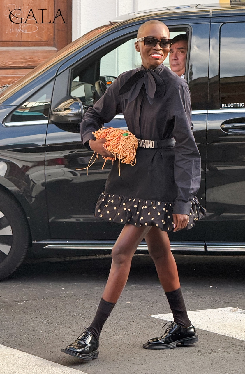 Также всеобщее внимание блогеров и модниц было приковано к сумке в виде спагетти от Moschino. В руках одной из гостей, пришедшей на стритстайл она напоминала полную тарелку этой итальянской пасты, а на подиуме во время шоу больше походила на милую болонку.