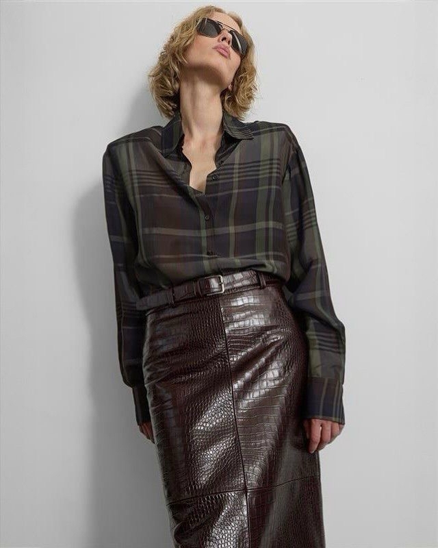 Клетка в тандеме с кожей – одно из самых эффектных сочетаний сезона. Мягкая шерстяная фактура принта и гладкий блеск кожи создают контраст, который выглядит дорого. Такой дуэт прекрасно сработает в городских образах: пальто в клетку плюс кожаная юбка или брюки. Добавьте сюда лаконичные аксессуары, сумку классической формы и обувь на устойчивом каблуке, чтобы получить современный образ.