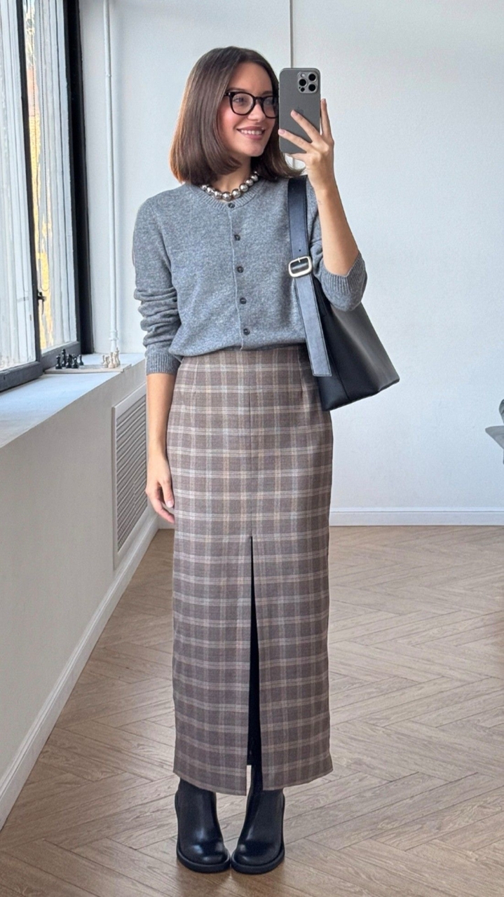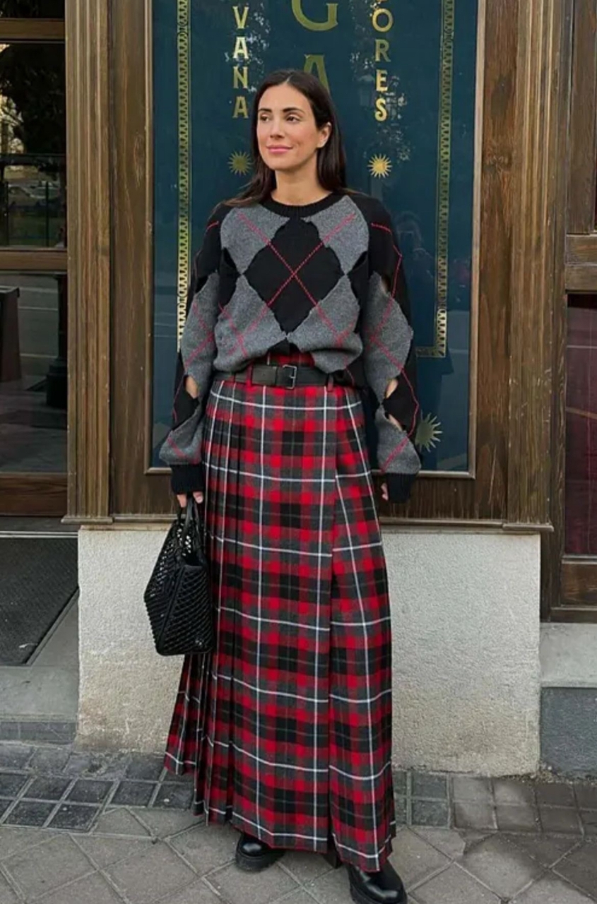 Юбка в клетку уже стала базой. Здесь решающий фактор - то, с чем вы будете ее носить. Чтобы создать элегантный образ, рекомендуем добавлять к юбке теплые колготки, кардиганы и обувь на аккуратном каблуке.