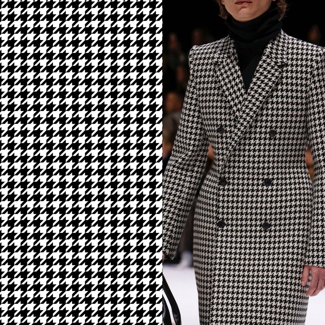 Принт «гусиная лапка» стал известен в мире высокой моды благодаря Кристиану Диору. Это мелкий черно-белый орнамент, который напоминает следы птицы. Такой узор всегда выглядит дорого и интеллектуально, особенно на жакетах, юбках и пальто. В сезоне 2025/26 дизайнеры предлагают экспериментировать и носить «гусиную лапку» в цветном прочтении: бордовом, изумрудном, шоколадном.