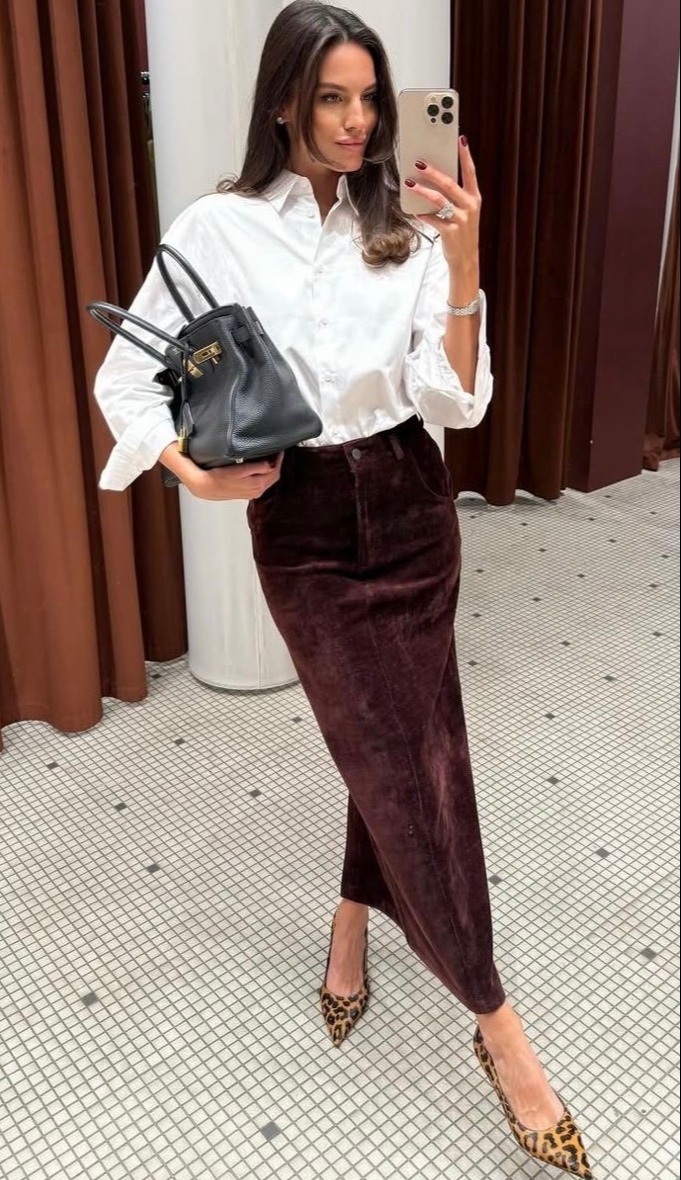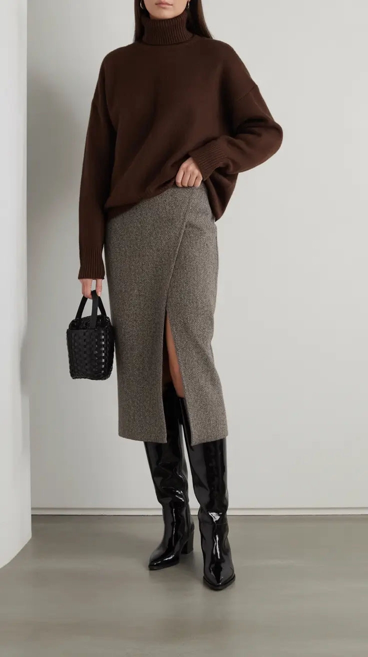 Юбка даже из качественной искусственной замши станет отличным вариантом для морозов. Такой материал плотный, а тепло держит в разы лучше, чем тонкие ткани. К тому же замша выглядит дорого и добавляет образу благородной фактуры. Носите такую юбку с высокими сапогами, тёплыми колготками, а чтобы поддержать настроение – добавьте в него замшевые перчатки или сумку из этого материала. Так у вас получится статусный зимний лук.