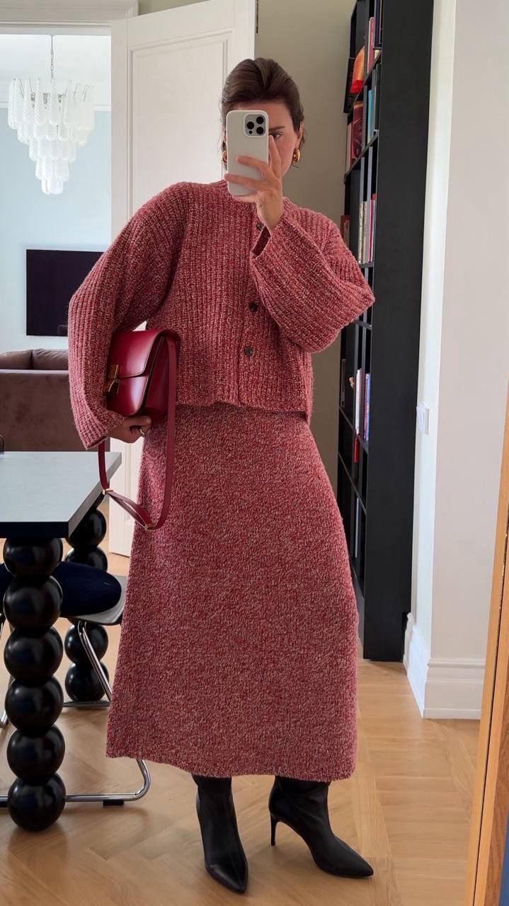 С удлиненным жакетом или кардиганом в юбке будет теплее за счет того, что верх надежно закрывает поясницу, которая считается самым уязвимым местом в морозы. Такой прием отлично сработает, если вы любите многослойность, ведь под жакет можно надеть лонгслив или водолазку, а сверху добавить дубленку или шубу.
