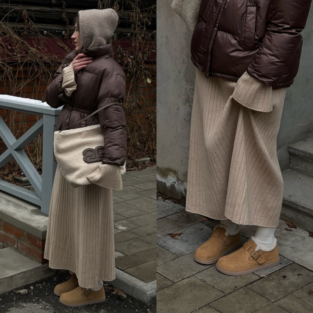 В качестве модели юбки здесь лучше выбирать длинный трикотажный вариант, так как именно он позволит добавить в образ мягкость. Сверху надевайте пуховик или уютную короткую шубу в актуальном шоколадном оттенке, а в качестве аксессуаров добавляйте вязаный шарф и шапку.