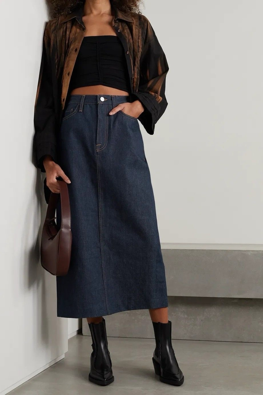 Деним зимой незаменим. Джинсовая юбка в длине миди или макси отлично защищает от холода благодаря своей плотной фактуре. Выбирайте модели из «жесткого» денима, ведь при стилизации они смотрятся структурно и позволяют легко сочетать юбку с пуховиками, дубленками и грубыми ботинками. Чтобы юбка из джинсы стала универсальной базой для повседневных образов, добавьте сюда плотные колготки и тёплый верх.